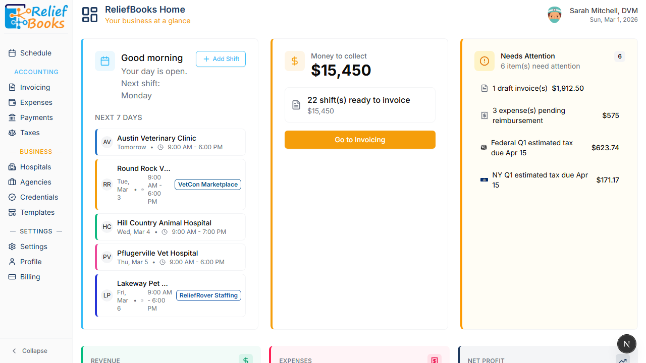 Relief work is shift-based, not project-based. Your calendar isn't just a scheduling tool — it's your general ledger. Every dollar you earn starts as a shift on a specific day at a specific clinic.