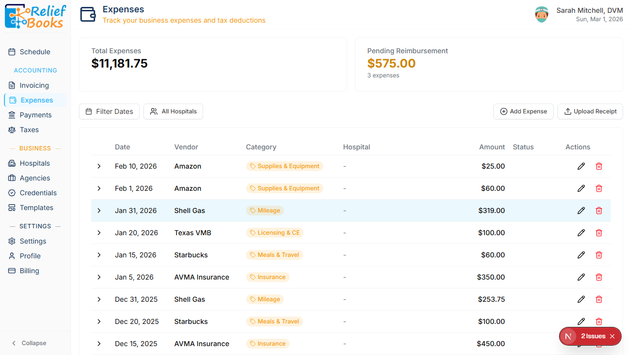 ReliefBooks categorizes your expenses using Schedule C-aligned categories from the start: Mileage, Meals & Travel, Licensing & CE, Insurance, Supplies & Equipment. When tax season arrives, your expenses are already organized the way your CPA needs them.