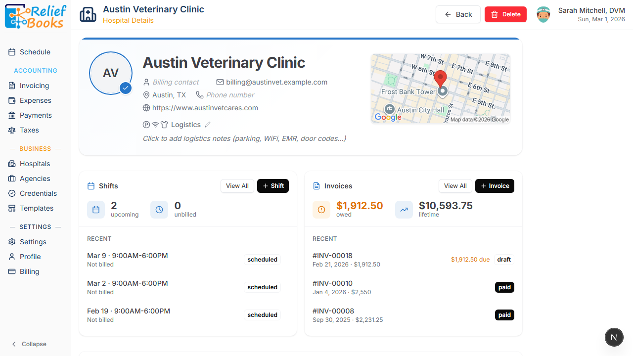 In ReliefBooks, you set up your Facilities (the clinics where you work) and your Agencies (the booking sources that pay you) as separate entities. When you log a shift, you link both — the facility you drove to and the agency that will pay for it.