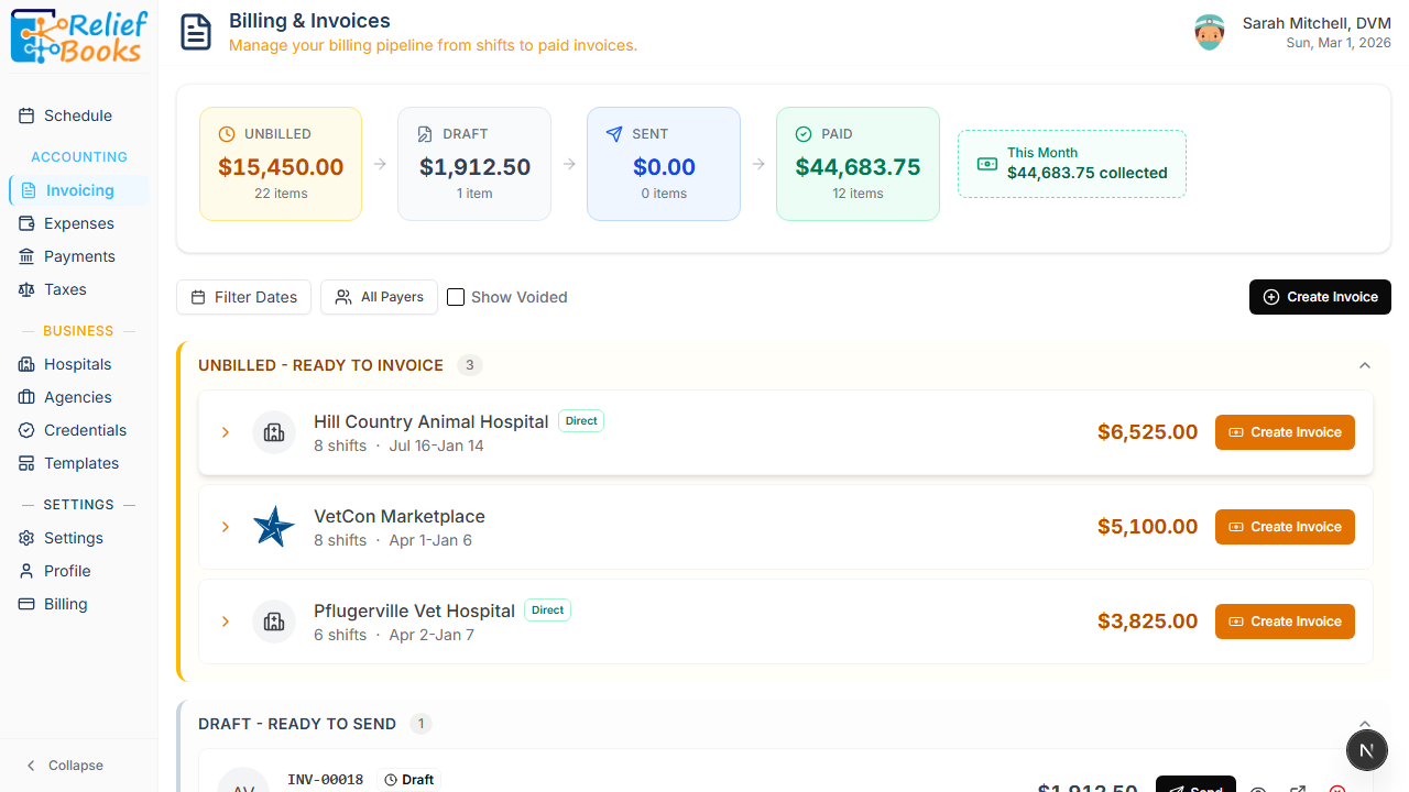 In ReliefBooks, unbilled shifts flow automatically into a billing pipeline. The Unbilled column shows you exactly how much money is sitting on the table — grouped by payer, with a "Create Invoice" button that pre-populates everything: the correct payer, line items from your rate card, shift dates, applicable taxes, and mileage charges. You review it, click send, and move on.