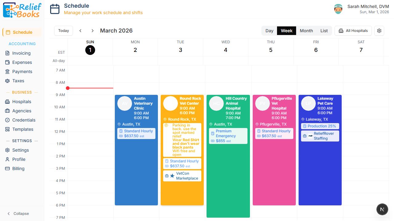 ReliefBooks gives you a unified calendar where every shift is color-coded by facility. At a glance, you can see where you're working, what you're earning, who booked you, and even logistics notes for each clinic. The schedule shows your rate card and estimated earnings right on the shift block.